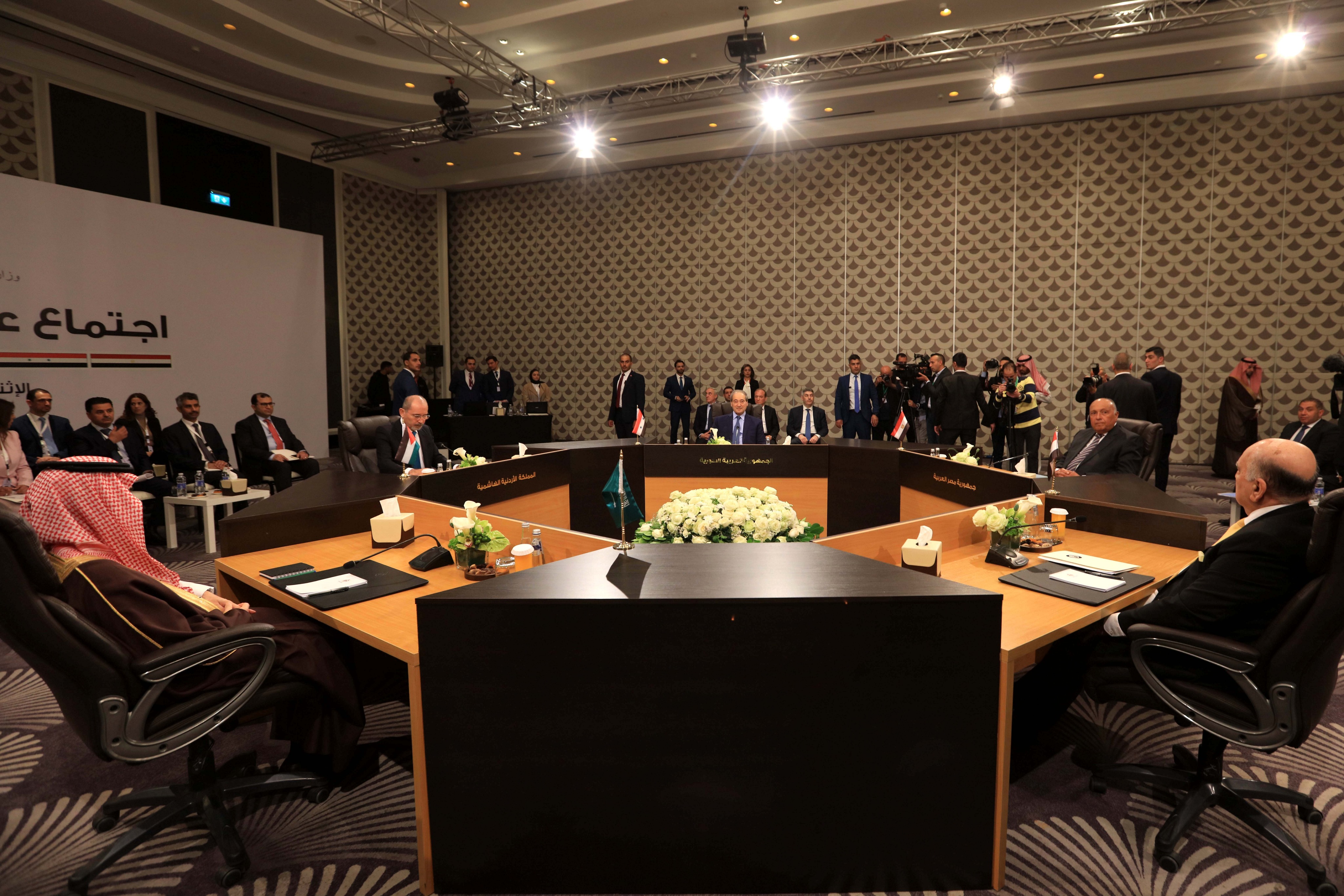 5月1日,约旦、沙特阿拉伯、伊拉克、埃及和叙利亚外交部长在约旦首都安曼举行会谈,商讨针对叙利亚问题的政治解决方案,并强调将解决叙利亚危机列为优先事项。新华社发(穆罕默德·阿布·古什摄)