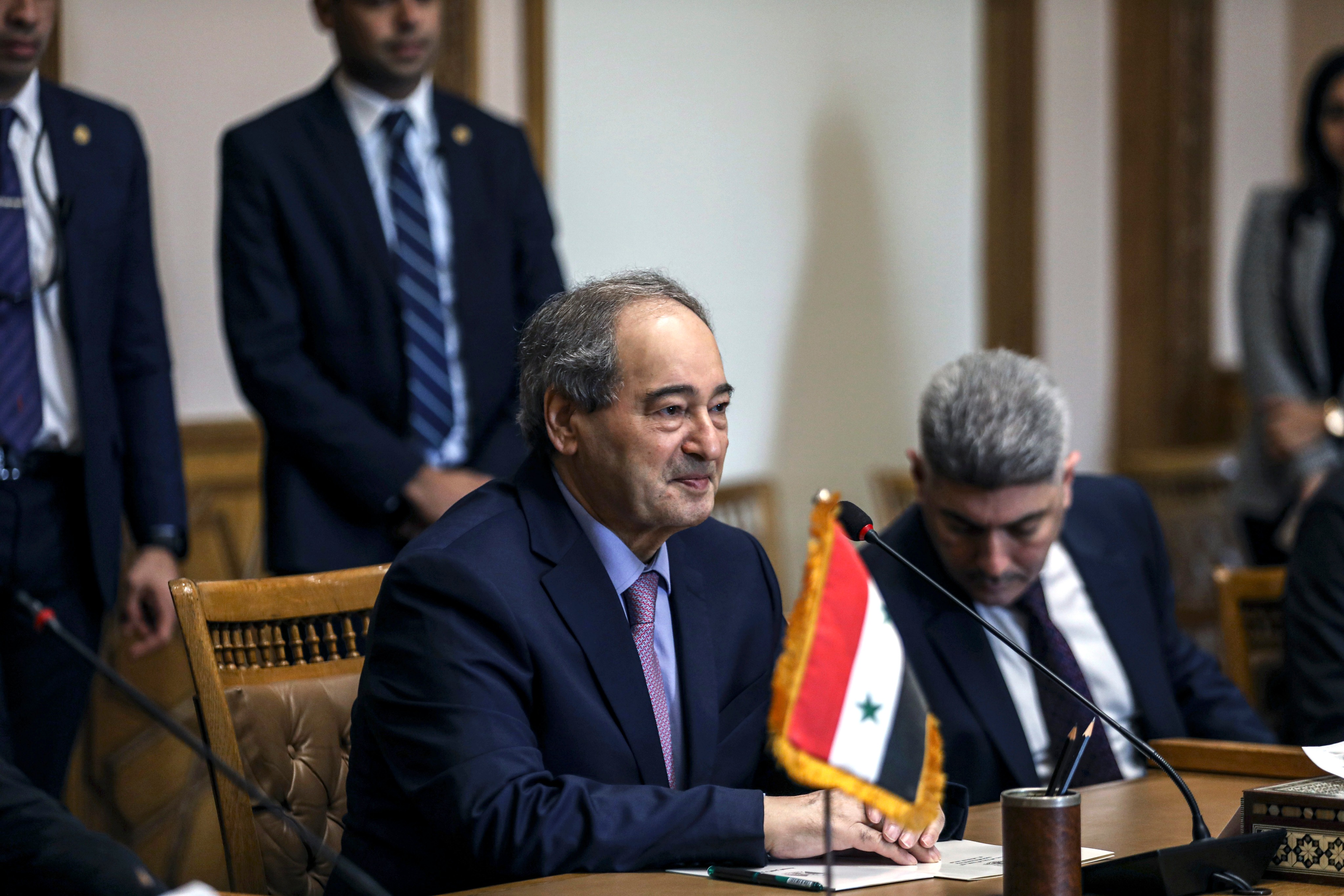 4月1日,在埃及首都开罗,叙利亚外长梅克达德(中)与埃及外长舒凯里(不在画面中)举行会谈。这是叙利亚外长时隔十余年后首次访问埃及。新华社发(艾哈迈德·戈马摄)